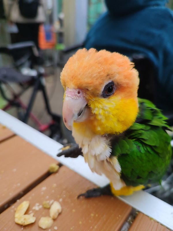 Manche Papageien waren besonders aufgeweckt und landeten auf der Schulter oder dem Haupt, offenbar der perfekte Ausichtspunkt um doch noch ein Stückchen Kuchen zu ergattern.