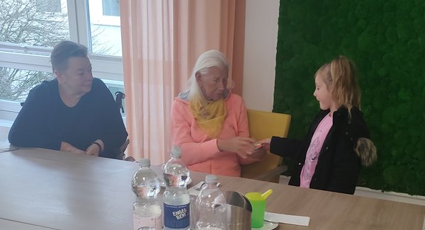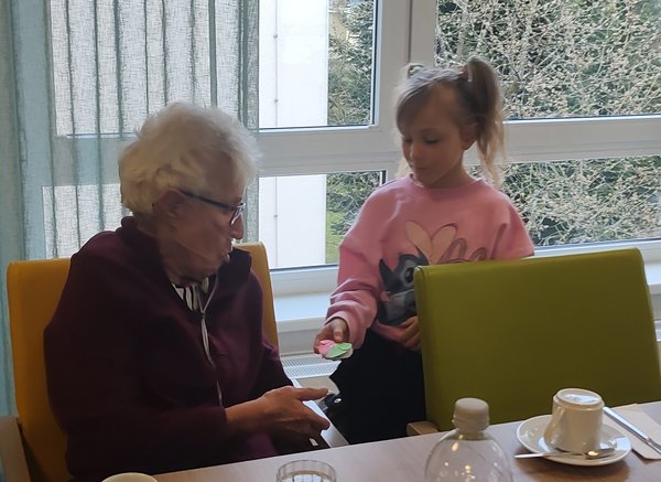 Zum Abschluss verteilten die Kinder kleine Schokoladenstücke, die in selbstgestaltete Ostereier verpackt waren. Die liebevoll vorbereiteten Geschenke wurden dankbar entgegengenommen und rundeten den gelungenen Besuch ab.